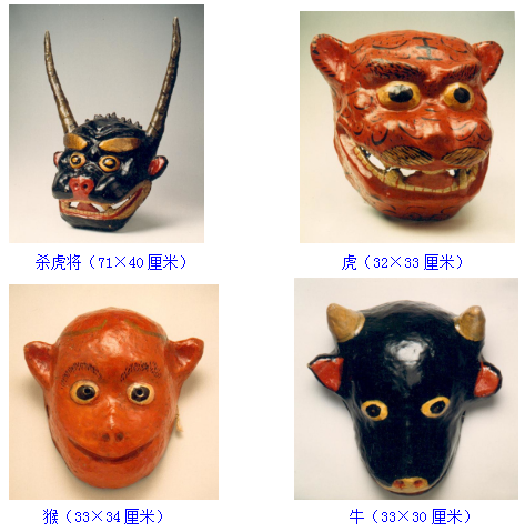 “殺虎將”反映的是當(dāng)?shù)匾暈樯酵鯛數(shù)臍⒒槊癯Γ捣匣⒌膬?nèi)容。面具角色有牛、虎、猴、殺虎將。牛象征農(nóng)民,代表善,虎和猴象征禍害。表演牛和虎、猴激烈打斗,當(dāng)牛被打敗倒地時,殺虎將持劍上場,打殺格斗等場面。此時場外觀眾上場助戰(zhàn),直至將虎降服,整個場面熱烈緊張。