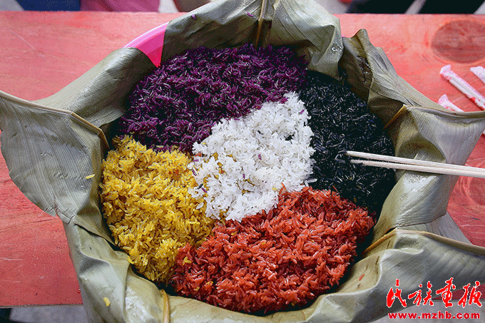 南方稻作民族將糯米用紫蕃藤、黃花、楓葉、紅藍(lán)草等泡染后再蒸煮出紅、黃、黑、白、紫的五色糯米飯,五色糯米飯一般在重要的節(jié)日中食用,以求吉祥。李琳攝影 引自民族畫報
