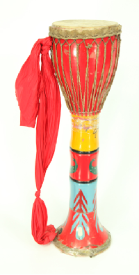 阿昌族的樂器主要有竹琴、洞簫、葫蘆簫(右圖,劉軍攝)、三月簫、銅口弦、三弦、象腳鼓(下圖,蒙哥提供)、铓鑼等。葫蘆簫是用葫蘆連接三根竹管制成的,它有7個(gè)音,音量小,音調(diào)低緩圓潤,一般晚上用。三月簫用一根竹管制成,也有7個(gè)音,它的音量大,音色細(xì)亮,多在白天使用。葫蘆簫和三月簫不僅是阿昌族人民心愛的傳統(tǒng)樂器,還是男女青年傳情示愛的媒介。