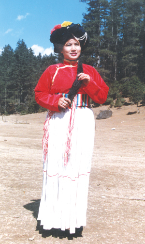 寧蒗地區(qū)的普米婦女多穿束腰、多褶的百褶裙,常用白藍等色的棉麻布制成,裙長幾乎拖至腳面。活動時,她們將裙子從左面提起,掖在腰間?! ?/p>