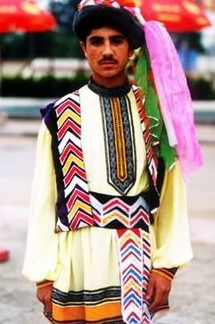 塔吉克族男子衣飾,白色襯衣外,穿一款青色或藍(lán)色的無(wú)領(lǐng)對(duì)襟“袷袢”長(zhǎng)大衣,腰系三角腰巾,腰巾繡花,右側(cè)掛一把小刀。體魄健壯的塔吉克青年與老人,常穿皮裝,封襟、交領(lǐng)、袖長(zhǎng)過(guò)手指、衣長(zhǎng)過(guò)膝的外衣,寬松得體;無(wú)扣,不開叉,用腰帶一束,緊身舒適。寒冬中披光皮大衣,穿皮長(zhǎng)褲,戴羊羔皮帽。夏季,也穿皮裝或絮駝毛棉大衣,戴白色翻毛皮帽,腳穿長(zhǎng)筒皮靴,輕巧、柔軟、結(jié)實(shí)耐磨,以適應(yīng)高山多變的氣候。
