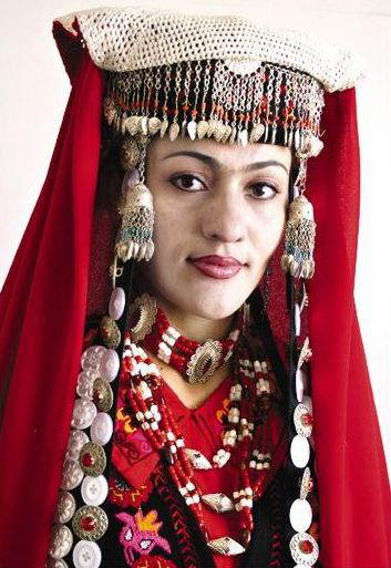塔吉克族女子愛戴首飾,最引人注目的要數(shù)新郎和新娘的裝束了。新娘的“庫(kù)勒塔”帽,前綴一排銀色小鏈子,戴長(zhǎng)長(zhǎng)的耳環(huán),頸部戴幾排碩大的項(xiàng)鏈。辮子上飾流蘇或白扣、銀元,手有手鐲、戒指。新娘頭上是一條長(zhǎng)長(zhǎng)的紅色或黃色頭巾,外穿紅色長(zhǎng)大衣,系紅白相間的手帕。