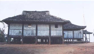 鎮(zhèn)康地區(qū)若干小家庭同住一幢房子,房?jī)?nèi)中間有寬敞的走道,兩旁為各小家庭住室,間壁而居,各有火塘,所以竹樓較大,有的占地近四百平方米。這種干欄式長(zhǎng)方形大屋居住形式源于過去德昂族地區(qū)仍保留父系大家族社會(huì)組織,也就是說有血緣關(guān)系的后代都共同居住在一所大房子內(nèi),房屋的大小要依據(jù)家庭成員多少而定。雖然隨著社會(huì)的發(fā)展和大家庭生活方式的改變而瓦解消失,但在解放初期還能看到它們的遺址或縮小了的原型。