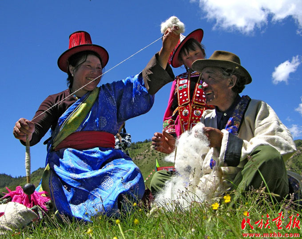 在放牧時裕固人常常捻羊毛。 央金 攝影 引自民族畫報
