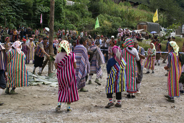 獨(dú)龍族的舞蹈多為祭祀性舞蹈,均為集體舞和“納目薩”跳的單人舞,隊形只有兩橫排交叉和逆時針方向圓舞兩種。剽牛舞是最具代表性的舞蹈,在不同的時間、場合用于不同的祭祀對象,在不同的村寨、不同的祭祀場合中,有不同的稱謂。