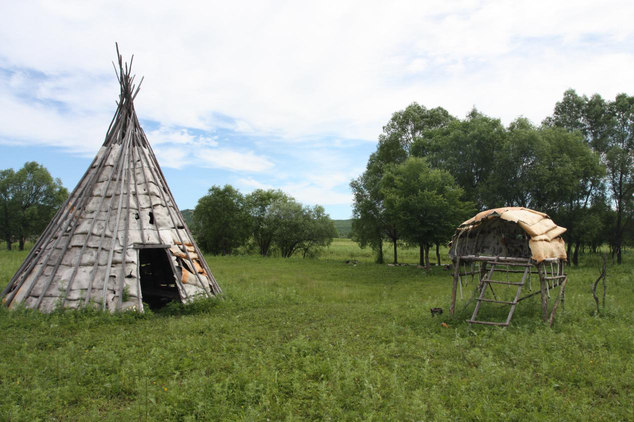 鄂倫春人還有兩種比較固定的住房,一種是“烏頓柱”,也就是土窯子或地窨子。選擇一個朝陽山坡,順坡地挖一個一米多深的坑,呈凹形,三面坑壁為房框,上面架梁,前面安門窗。還有一種是“木刻楞”,選直徑約30厘米的圓木,截成長度相等的樹段,把每一根樹段的兩面都砍平,兩端還要砍出相同規(guī)格的凸形和凹槽,然后一層一層往上垛,垛時使兩端的凸凹相互咬合,這樣垛成房框,無需釘釘,非常牢實。這兩種住房里面都可以搭火炕和爐灶,主要用來過冬。夏天還有兩種簡易住房,鄂倫春語叫“林盤”和“庫米”,就是兩種樺皮棚,一般搭蓋在“烏頓柱”、木刻楞和“斜仁柱”的旁邊,主要用以盛夏避暑。