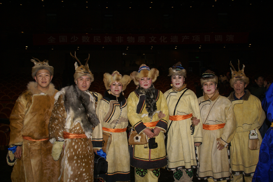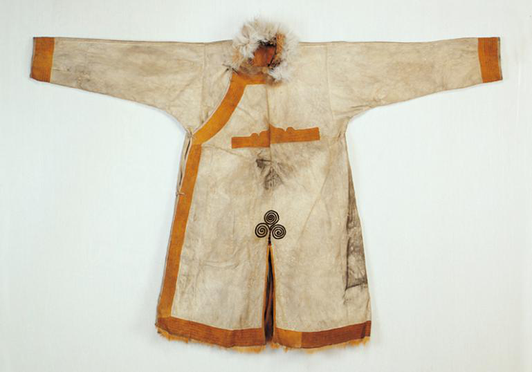 鄂倫春族的傳統(tǒng)服裝以袍式為主,冬季穿“蘇恩”?!疤K恩”是用冬季絨毛狍皮縫制的右任長(zhǎng)袍,小立領(lǐng),襟邊、下擺和袖口用黑色皮鑲嵌云卷花紋等邊飾,女袍還要作環(huán)肩裝飾。為便于奔跑和騎馬,“蘇恩”都有開衩,衩口裝飾圖案豐富多彩。夏天穿用夏季沙毛狍皮制作的短袍或坎肩,布匹傳入以后穿布袍。 男子下身穿狍皮短褲,褲腿過膝,樣式如老式免襠褲,后來改穿長(zhǎng)褲。出獵時(shí)褲子上面還要穿套褲。套褲無襠,呈筒狀,上角釘有皮條,系在腰帶上。一般用夏季的狍皮縫制,因?yàn)橄募镜尼笃ぐ搴衲湍ィ灿杏寐蛊たp制的。婦女的褲子樣式比較獨(dú)特,長(zhǎng)至腳面,比男褲瘦些,腰兩側(cè)有開衩,前面有兜肚,兜肚頂端釘皮條,系在脖子上。這樣的褲子,既保暖又便于騎馬,可以護(hù)住前心,又起到了乳罩的作用。講究的人還在褲子兩側(cè)和褲腳處繡上花邊圖案。