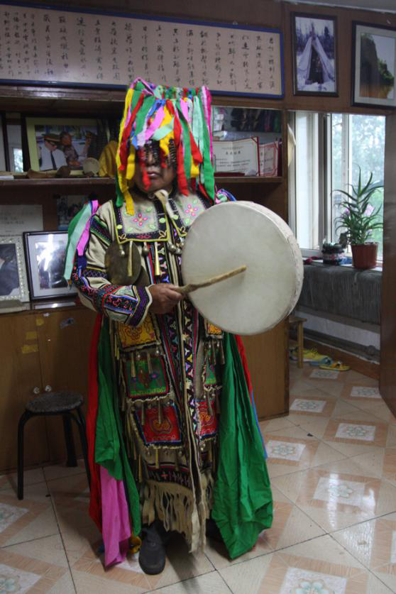 冬天穿的鞋是“奇哈密”和“溫得”,“奇哈密”是用狍脖皮或犴皮做靴底,用狍腿皮拼縫成靿的短靴?!皽氐谩笔怯寐够蜥砥ぷ龅祝够蜥硗绕て纯p成靿的長(zhǎng)靴?!皽氐谩币?yàn)殪壐撸齑┲颢C不易灌雪。這兩種靴子都要用冬季絨毛狍皮做成的襪子配套穿用,暖和跟腳,踩在雪地上沒有聲響。夏天一般穿“奧勞其”,是一種皮底布靿短靴。“考呼落”,是用冬季絨毛狍皮縫制的二指手套,掌面腕部留一縫口,手從縫口中伸出,手套仍護(hù)在手背上,既使在零下40度的嚴(yán)寒中處理獵物,也不用擔(dān)心手被凍壞。還有一種五指狍皮手套,背面正中繡花、蝶等中心圖案,五指的關(guān)節(jié)和指甲處繡出各種小型圖案,然后用連理枝將中心圖案和關(guān)節(jié)、指甲圖案連為一體,中心圖案代表手掌,手指圖案代表關(guān)節(jié)和指甲,連理枝代表骨骼和血脈(圖為越來越鮮見的薩滿服飾,吳雅芝供圖)。