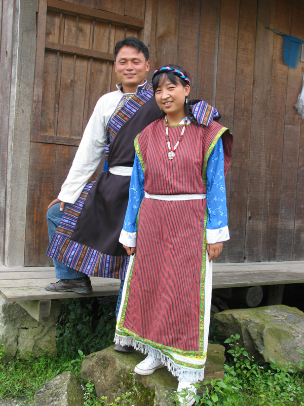 墨脫一帶的門巴族,由于氣候的差異,過去,男的不戴帽子,頭發(fā)編成辮子,一般不穿鞋。女的喜歡戴耳環(huán)、手鐲、戒指。穿著上男女服飾白顏色的多,分長袍、裙子、短衣、短袖,用棉線或羊毛線編織而成。婦女喜穿豎條紋裙子,有紅、綠等顏色,式樣相似,選料各異。
