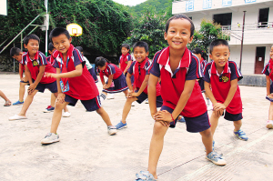 小學(xué)生們在學(xué)校操場上體育課。