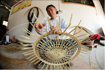 (手藝人正在編制竹編工藝品)
