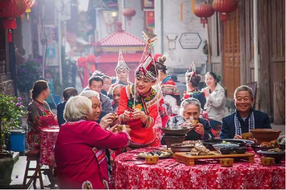 2.畬族婚嫁:婚禮的特色較多。迎親隊(duì)伍到村時(shí),嫁方村上女性拿杉木枝欄路,表示晚上要對(duì)歌;到中堂時(shí),嫁方請(qǐng)四位男子與迎親隊(duì)伍中四人相對(duì)作揖,此儀式叫“拾田螺”,表示歡迎;中餐由嫁方請(qǐng)迎親隊(duì)伍,媒人就坐中堂席首位,叫“落腳酒”;晚餐由娶方請(qǐng)嫁方親戚朋友,舅公就坐首席,叫請(qǐng)“大酒”;午后,赤郎舉行“借鍋”儀式,赤郎端點(diǎn)紅燭放有一刀肉和兩塊豆腐的米篩向灶神作揖后,用謎語(yǔ)念借所有的炊具,姑嫂們把能藏的炊具都藏起來,念不到就不拿出來,要全部重借,“借鍋”意為娶方借嫁方炊具宴請(qǐng)客人。借好之后,赤郎要?dú)⑷⒎郊姨魜淼囊恢还u用以嫁方“請(qǐng)祖公”,殺雞時(shí),規(guī)定血不許滴到地上,滴一滴地上罰一碗酒;宴席中途嫁方女歌手會(huì)起歌頭找赤郎對(duì)歌。畬族婚禮的又一個(gè)特點(diǎn)是,新娘夜行嫁,卯時(shí)進(jìn)夫家門。行嫁時(shí)有牛在前頭踏路,意為新娘一切都要新的,牛踏過的路為新路。以往嫁妝有鋤頭、斗笠、棕衣、線簍、火籠等,體現(xiàn)了畬族婦女熱愛勞動(dòng)。