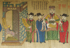 與畬族有關(guān)的圖畫主要包括清朝乾隆年間皇家繪制的《皇清職貢圖》,畫內(nèi)有相關(guān)的畬族資料和家族祖圖。今藏的祖圖多為清代物品,以麻布、土布為底,平圖勾勒,濃墨重彩,以條狀橫幅長(zhǎng)卷居多,也有直幅多屏組合而成的。畫面配有文字說(shuō)明,圖文并茂,展示了畬族的歷史發(fā)展、社會(huì)生產(chǎn)、文化習(xí)俗等。畬民家族祖圖分布范圍較廣,主要在福建、浙江、廣東等省。