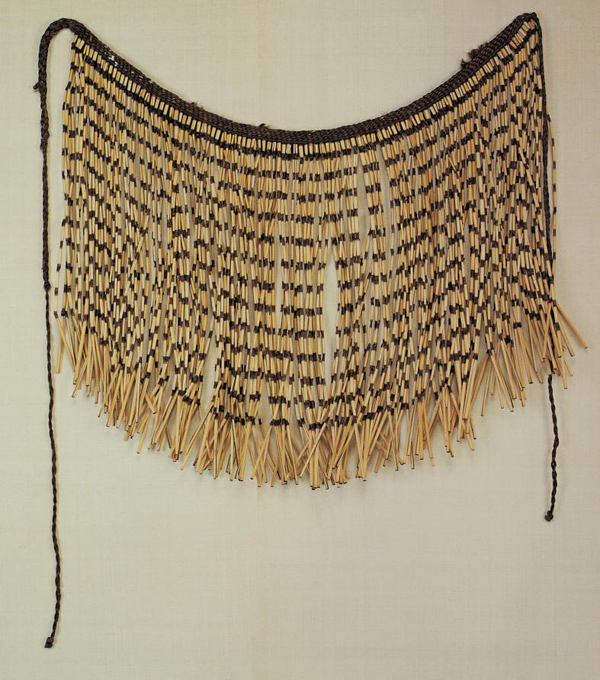 博嘎爾婦女穿一種叫“基都”的短上衣。用野麻織成的土布縫制,其樣式為無領(lǐng)、短袖、對襟。下部穿用羊毛織成的粗呢緊身筒裙,稱作“結(jié)邦”。小腿部扎裹腿,叫“涅蘇木”。條件好的人家外面還會罩一件稱為“階納布”的披肩。希蒙部落的婦女穿當(dāng)?shù)孛藁棾傻陌咨蛩{(lán)色的寬大對襟短上衣。下身穿筒裙,裙子下擺較寬,上面織有黃紅色或黃黑色的簡單圖案(圖為民國時期的珞巴族草裙,中央民族大學(xué)民族博物館館藏)。