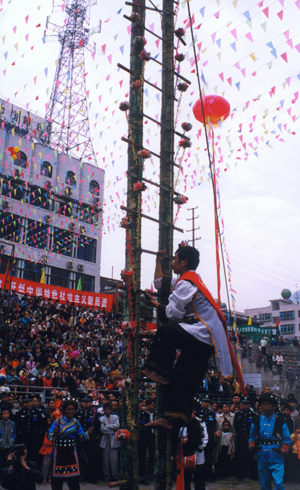 節(jié)日里,婦女們穿著鑲花邊的黑色上衣和點(diǎn)綴著各種銀飾物的花裙,佩戴耳環(huán)、項(xiàng)鏈等首飾,風(fēng)采奪人。男人穿著麻布短衣褲,腰系紅黃長(zhǎng)帶,小腿系吊簡(jiǎn),腰佩長(zhǎng)刀,肩挎箭包,英姿勃勃。節(jié)目的廣場(chǎng)上,堅(jiān)趄兩根二十米高的樹(shù)干,四周用藤蔓拉緊固定,樹(shù)桿上插有三十六把明晃晃的長(zhǎng)刀,作為向上攀登的橫檔,刀刃向上,寒光逼人,謂之“刀竿午間。鞭炮齊鳴,鑼鼓震天”。身穿大紅抱、頭纏紅布包頭、赤腳的五名“玩火者”,齊涌至竿下,圍繞刀竿唱歌跳舞,將斟滿的白酒一飲而盡,縱身飛上刀竿。雙手緊提刀面,運(yùn)足氣的腳掌斜置在鋒利的刀刃上,勇敢、靈巧地向上攀登。全場(chǎng)鴉雀無(wú)聲,大家屏住呼吸仰面觀看,對(duì)他們的氣功絕技贊嘆不已。噼噼啪啪的鞭炮聲來(lái)自竿頂優(yōu)勝者,響徹云霄。全場(chǎng)歡呼跳躍,爭(zhēng)相向爬桿者敬獻(xiàn)美酒。對(duì)歌、跳舞、蕩秋千活動(dòng)為節(jié)日增添了濃郁的氣氛。丟煙包(煙盒)活動(dòng)別具一格,青年男女各站一方,互擲煙包,姑娘將小伙的煙包收藏起來(lái),說(shuō)明姑娘接受了小伙子的愛(ài)慕。