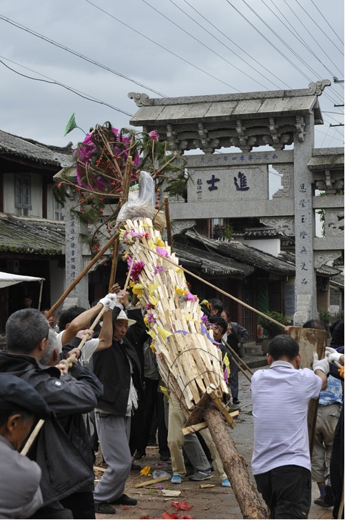 在劍川,都是由家里喜添子嗣的人家來籌備火把節(jié)的一切事宜,除了對新生兒的祝福,火把樹的裝扮也表示劍川人祈愿風(fēng)調(diào)雨順,人壽年豐、鄰里和諧。火把要扎十二層(閏年要扎十三層),上面六層的明子和柴分別由細(xì)到粗,一層接著一層,下面七層都是一樣的新柴。喻示每一個新的日子都紅紅火火。