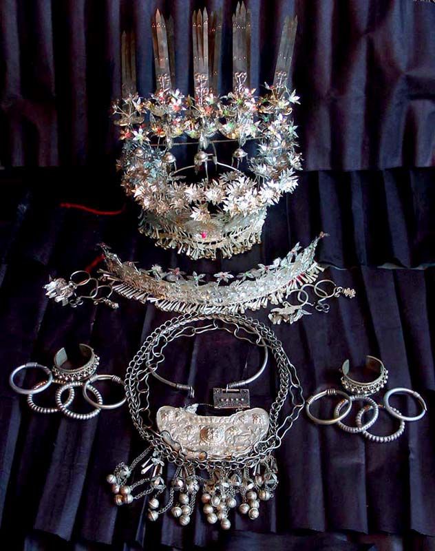 據(jù)苗族古歌傳唱,早期的苗族銀飾以胸飾、手飾為主,其中胸飾由冷兵器時(shí)代的護(hù)心鏡演變而來(lái),手鐲最初是巫術(shù)中的兒童辟邪之物。后來(lái),由于不同苗族支系文化的相互滲透,用于服飾裝扮的內(nèi)容和形式逐漸豐富,遂演變成現(xiàn)在豐富多彩的苗族銀飾。