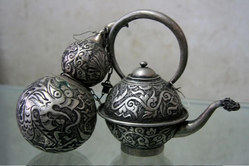 銀飾造型通常以龍、虎、牛、馬、鳥、昆蟲、花卉等動(dòng)植物圖案為元素,經(jīng)過(guò)溶銀、錘片、拉絲、鑄模、做花、絞絲、編花、焊接、洗花等多道工序完成。成型的銀飾在最后一道工序中,需放入硼砂與火硝的混合液中浸泡,再高溫烘干并加熱至紅色,然后再放入明礬水中洗滌,去除污物和雜質(zhì),即可生成銀金屬特有的質(zhì)感和光亮。劍河苗族銀飾工序繁復(fù),技藝精湛,造型栩栩如生,成品精美絕倫。