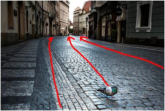 這張圖是布拉格阿的一個早晨,大概是早上五點多鐘,路上很安靜,天開始蒙蒙亮,我就拍了一張很安靜的街道,首先看到的興趣點是一只鴿子。路面形成的引導(dǎo)線以及通過路面反光形成的引導(dǎo)線來達(dá)到的,把目光從這只鴿子引向遠(yuǎn)方。