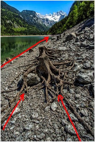 這個片子的興趣點是樹樁,樹樁根系和湖岸形成的引導(dǎo)線,把我們的目光從樹樁根系一直在往前推,一點點推到雪山,并不是跳躍性的看到雪山。觀者進入畫面是一個逐步的過程,是一直有引導(dǎo)線引導(dǎo)著你,最后看向了遠(yuǎn)處的森林和雪山。