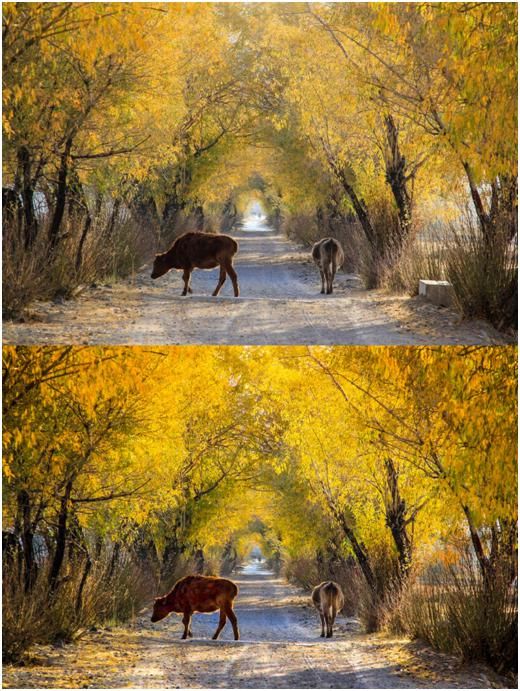 我們將遠(yuǎn)處部分的高光壓低,提亮了一下黃色的樹葉和地面的光照,加強了地面的陰影,這樣就有了一個比較通透明快的感覺,空間的縱深效果也有了加強。另外也稍微提亮了牛身上的亮度,但不能提的太亮,因為這樣的話會使片子的噪點比較大,同時也會失色。