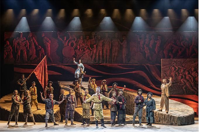 在舞蹈語言的設(shè)計(jì)上,編導(dǎo)融入當(dāng)代元素,使觀眾不但感受到審美的親切與現(xiàn)代感,而且還自然地進(jìn)入回望歷史的情境,對(duì)其思想內(nèi)涵的理解更為準(zhǔn)確。該劇的道具使用和調(diào)度也頗為大氣,令人印象深刻。一組斜坡狀的大型舞臺(tái)道具不但由群眾演員直接移動(dòng)而實(shí)現(xiàn)即時(shí)的場景調(diào)度,還可使演員上下和左右而行,最終組合成巨大的中國共產(chǎn)黨黨徽,輔助完成了人民英靈和英雄的形象塑造。