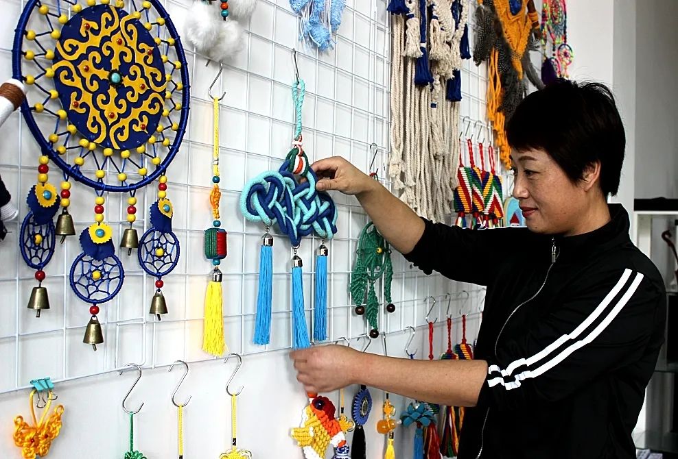 此外,繩結(jié)技藝傳承人把傳統(tǒng)工藝帶去了鄉(xiāng)村,讓傳統(tǒng)手工藝也成為了扶貧的一種助力。她們組織村里的婦女進(jìn)行培訓(xùn)、學(xué)習(xí)。通過手工藝術(shù)村里的婦女們有了生存的技能,目前大多數(shù)村民及貧困戶在第一次培訓(xùn)的基礎(chǔ)上,已經(jīng)充分掌握了繩結(jié)技藝,能夠編織出一個合格的繩結(jié)產(chǎn)品,變成了名副其實的“巧娘”。她們扶貧村有協(xié)日塔拉嘎查、四方地村等。