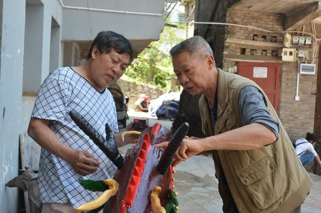 家住鎮(zhèn)遠縣?陽鎮(zhèn)東關(guān)社區(qū)的皇安東,今年68歲,雖然年近古稀,但精氣神堪比五十來歲的中年人,皇安東介紹由于個人愛好,8歲時與龍舟接下了深厚的情緣,對“龍”文化研究的執(zhí)著像一如往日對戀愛的投入充滿激情和憧憬一樣,經(jīng)過60多年的龍舟文化研究探索,他手工雕刻的龍頭威武靈動融匯鎮(zhèn)遠傳統(tǒng)文化精髓,“鎮(zhèn)遠賽龍舟”已被列為國家非物質(zhì)文化遺產(chǎn)項目名錄?;拾矕|49歲開始自學(xué)雕刻龍頭,鎮(zhèn)遠端午節(jié)每年祭祀用的龍頭幾乎出自他手,雕刻的龍頭已上數(shù)百頭。當(dāng)筆者提到皇安東為何歷經(jīng)六十多年對雕龍頭的“手藝”癡心不改時,他笑著爽朗地說:“我一生雕龍頭,主要的精神動力是對鎮(zhèn)遠傳統(tǒng)龍舟文化的熱愛和傳承?!被拾矕|一家人整天在“龍”的藝術(shù)空間里過得有滋有味。