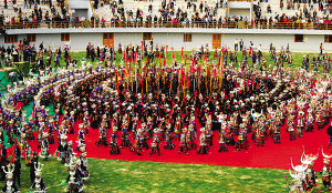 貴州省黔東南苗族侗族自治州雷山縣作為中國(guó)苗族歷史上大遷徙的集結(jié)地和中國(guó)苗族文化中心,以厚重獨(dú)特的文化,包括苗年在內(nèi)的11項(xiàng)文化遺產(chǎn)登上了中國(guó)非物質(zhì)文化遺產(chǎn)的殿堂。苗年是苗族一年中最重要的祭祀傳統(tǒng)節(jié)日,是苗家人的一大盛事,每年都有來(lái)自全國(guó)乃至全世界的游客到雷山參加苗年活動(dòng)。圖為紅火熱鬧的苗年歡慶場(chǎng)面。
