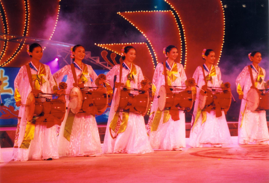 扇舞:表演者多為女性,需持花扇表演。源于古代巫女活動(dòng)及民俗活動(dòng)中的扇子表演,后發(fā)展成為單扇舞、雙扇舞兩種形式。扇舞有持一把或兩把扇具的不同形式,它具有朝鮮族特有的節(jié)奏、含而不露的內(nèi)在情緒、曲線(xiàn)性的律動(dòng)和自由自在的表演,隨著隊(duì)形的不斷變化,舞者將手中的扇具可組合成豐富多樣的圖案和造型。