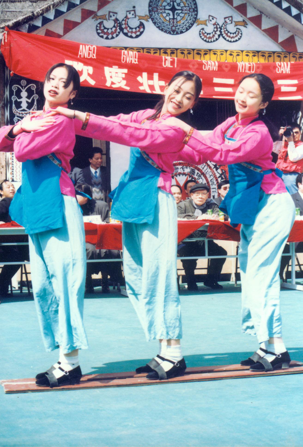 壯族傳統(tǒng)的娛樂性舞蹈主要是在節(jié)日或喜慶期間舉行。類型主要為模擬勞動(dòng)舞和擬獸類舞兩種。模擬勞動(dòng)舞表現(xiàn)壯族人民的生產(chǎn)勞動(dòng)的樂趣。如紅水河流域的壯族在春節(jié)舉行的孝蛙婆活動(dòng)中所跳的撈蝦舞、捕魚舞、狩獵舞、撒秧舞、插田舞、收割舞。壯族各地流行的扁擔(dān)舞、采茶舞、繡球舞、舂堂舞、板鞋舞等。這類舞蹈的動(dòng)作舒緩柔和、抒情柔美、表現(xiàn)了農(nóng)業(yè)民族的細(xì)膩性格。擬獸類舞是模仿獸類肢體語言的一種舞蹈,此類舞蹈在壯族地區(qū)也頗為流行。最常見的是蛙舞、舞獅、舞龍、和舞春牛?;ㄉ缴系耐苄挝枳穗p手彎肘向上,兩腿半蹲成騎馬式,動(dòng)勢(shì)很大。此外,壯族各地還有螞拐舞、彩蝶舞、魚蚌舞、馬鹿舞、金雞舞等。動(dòng)作總體來說舒緩柔和、抒情柔美。但表現(xiàn)勞動(dòng)的舞蹈緊張熱烈,表現(xiàn)抗?fàn)幍奈璧复挚裼辛?,模擬動(dòng)物的詼諧逗趣,呈現(xiàn)出多姿多彩的形態(tài)。