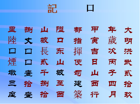 口記:大明洪武二十九年,歲次丙子,四月甲寅吉日,山西行都指揮使司修筑隘口,東山坡至西山坡,長二千八十八丈,口口一十一里六,口煙墩三座。