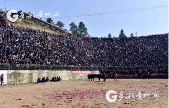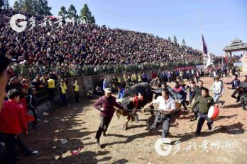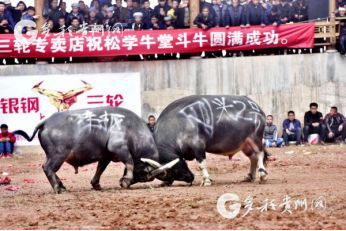 貴州省從江縣第十五屆原生態(tài)侗族大歌節(jié)的前一天,恰逢該縣逢亥斗牛日,丙妹鎮(zhèn)松學(xué)斗牛塘、谷坪鄉(xiāng)四寨河斗牛塘同時(shí)舉辦傳統(tǒng)牛王爭霸賽,喜迎一年一度“侗族大歌節(jié)”的到來,共有來自周邊村寨的80頭水牯牛參戰(zhàn),斗?;顒?dòng)場上名牛角逐,場面異彩紛呈,吸引數(shù)萬名觀眾前來觀戰(zhàn)。