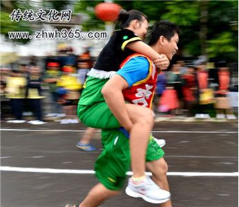 在昌江黎族自治縣一帶流行。每年的農(nóng)歷十五前后,孩子們就聚居在一空曠地,舉行村與村之間比賽??筛鶕?jù)人數(shù)來分組,每組2人(一男一女),每次由兩組進行,實行淘汰制,男背著女或女背著男亦可,與對方互相碰撞,男女通過踢、拉、推等動作,千方百計地把對方背著的人或拉下,或把兩人分開,或倒地。在場觀看的人興高采烈,笑聲不斷,其樂無窮。
