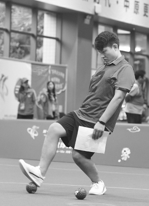 在分組循環(huán)賽女子單蹴中,河北隊員趙佳美遇到了強(qiáng)勁對手——福建隊男女混合雙蹴一等獎得主鐘金雪。趙佳美發(fā)揮得不錯,雙方比分始終咬得很死。鐘金雪起腳擊球干凈利落,在比分上形成壓制。