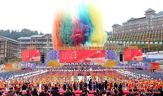 各民族同胞身著盛裝、歡聚一堂,通過(guò)民族風(fēng)情展示、龍獅展演、文藝表演、跳民族團(tuán)結(jié)舞等活動(dòng)歡慶縣慶,展示了龍勝民族團(tuán)結(jié)進(jìn)步事業(yè)全新風(fēng)貌與經(jīng)濟(jì)社會(huì)發(fā)展成果,各族人民脫貧致富的幸福感,以及各民族親如一家、共同團(tuán)結(jié)奮斗、共同繁榮發(fā)展的新氣象。
