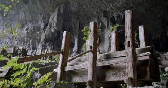 果里巖洞葬位于貴州龍里縣擺省鄉(xiāng)果里村東1公里煤洞坡的洞穴中,地處巖溶山原,峰叢林立,喬灌間雜。該洞在山頂下四十米處呈南北向橫穿山體,長580米,寬為38—65米,高為21—50米,有兩個入口;北面入口,寬54米,高21米,;南面入口,寬35米,高45米,有三道石砌墻垣。洞中地勢內斜平緩,洞內干燥,能見度好,入口處地勢外斜。據(jù)查,果里的苗族于明朝初期從貴陽遷徙而來。從遷徙之初至清末,他們均習慣將亡者殮于棺木集中存放在洞穴之內。在洞穴北面入口3000平方米的范圍內現(xiàn)存完好的棺木有192具,腐朽散落及其它原因損毀的約200余具。棺木材質為杉木。棺木有平板平頭和鼓型雄頭之分,其大小因亡者的體型而定。平板平頭型棺木制作粗糙,長1.45—2.23米,寬0.46—0.75米,高0.46——0.9米;鼓型雄頭棺木多為杉木本色,長1.5—2.23米,寬0.48—0.8米,高0.5—0.9米。棺木一律頭向北面入口,均固定于兩個或三個“井”字架上;三個“井”字架表明亡者為男性,兩個“井”字架的為女性。棺內亡者頭靠凹型木枕。平板平頭棺為明代,鼓型雄頭棺為清代。