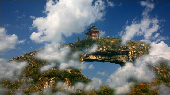仙橋山位于貴州甕安縣城西南5公里的仙橋村,雄峙于南北伸展的長(zhǎng)嶺之巔。山頂有一長(zhǎng)方形穿洞,遠(yuǎn)望似一面中天明鏡,又若仕女發(fā)髻上的一匹玉簪。民間傳說,那高懸的“橋洞”,是神通廣大的仙人張三豐發(fā)怒時(shí)一拳擊穿的。站在“橋”下仰望“橋”頂,如巨粱橫亙天際,青崖黛壁,輝映云天。天衣無縫的“橋身”和兩邊的“橋墩”,渾然一體,構(gòu)成跨度約40米,寬20米,高約35米的“橋拱”?!皹蚬啊北泵娴摹皹蚨铡蹦_有形狀各異的石洞,曲徑相通。洞壁有形似人腳印石凹,傳說是仙人張三豐到此云游留下的足跡。