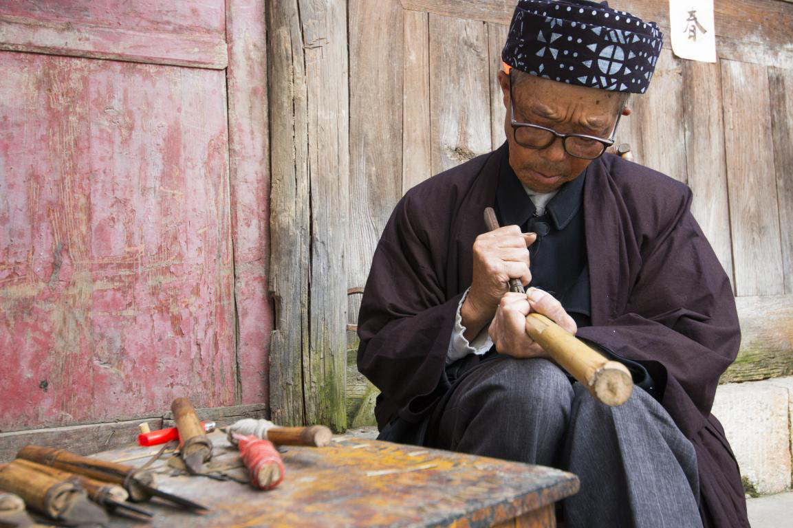 批林村除了傳統(tǒng)民居之外,自然還有屬于他們的傳統(tǒng)服飾。批林村的男子傳統(tǒng)服飾較為簡單,主要以青藍色斜襟長衫為主,頭飾用六米長的布條圍成的帽子。在批林村鬼師的穿戴中,與眾不同的是,鬼師還會外披一件亮黃色大衣,胸前帶有銀圈。