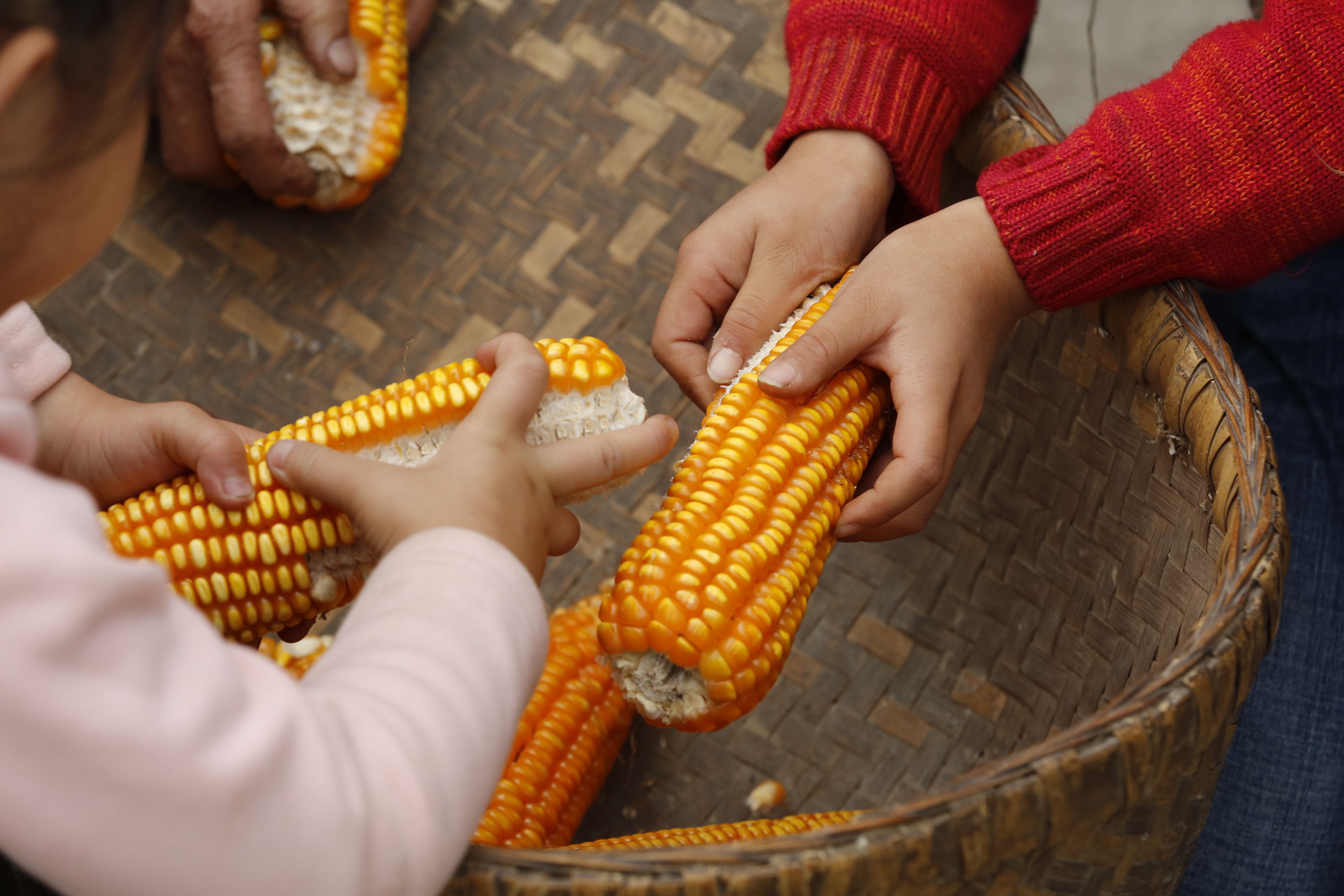 圖片說明:貴州貴陽苗族老年人與兒童剝玉米