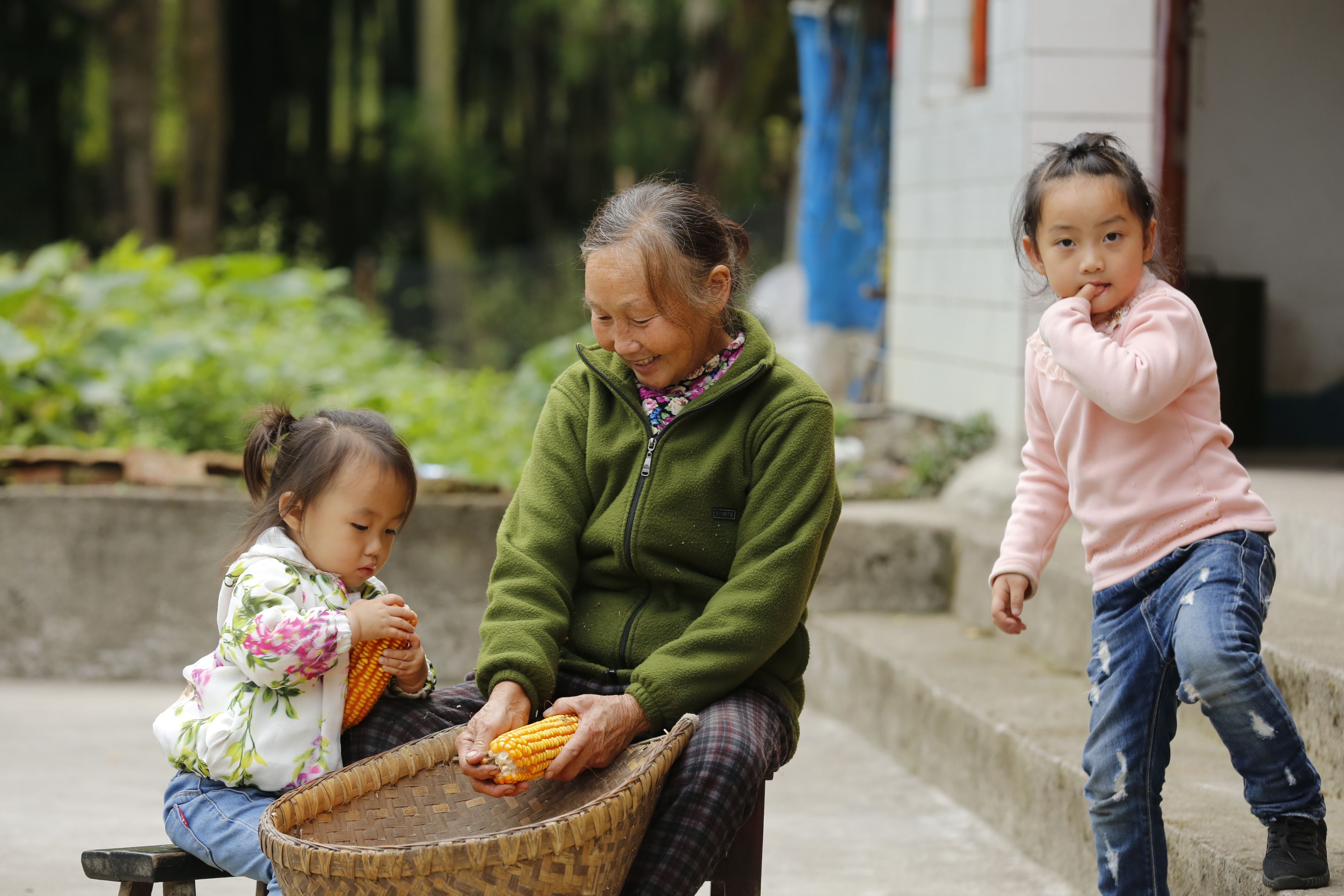 圖片說明:貴州貴陽苗族日常生活-老年人與兒童剝玉米